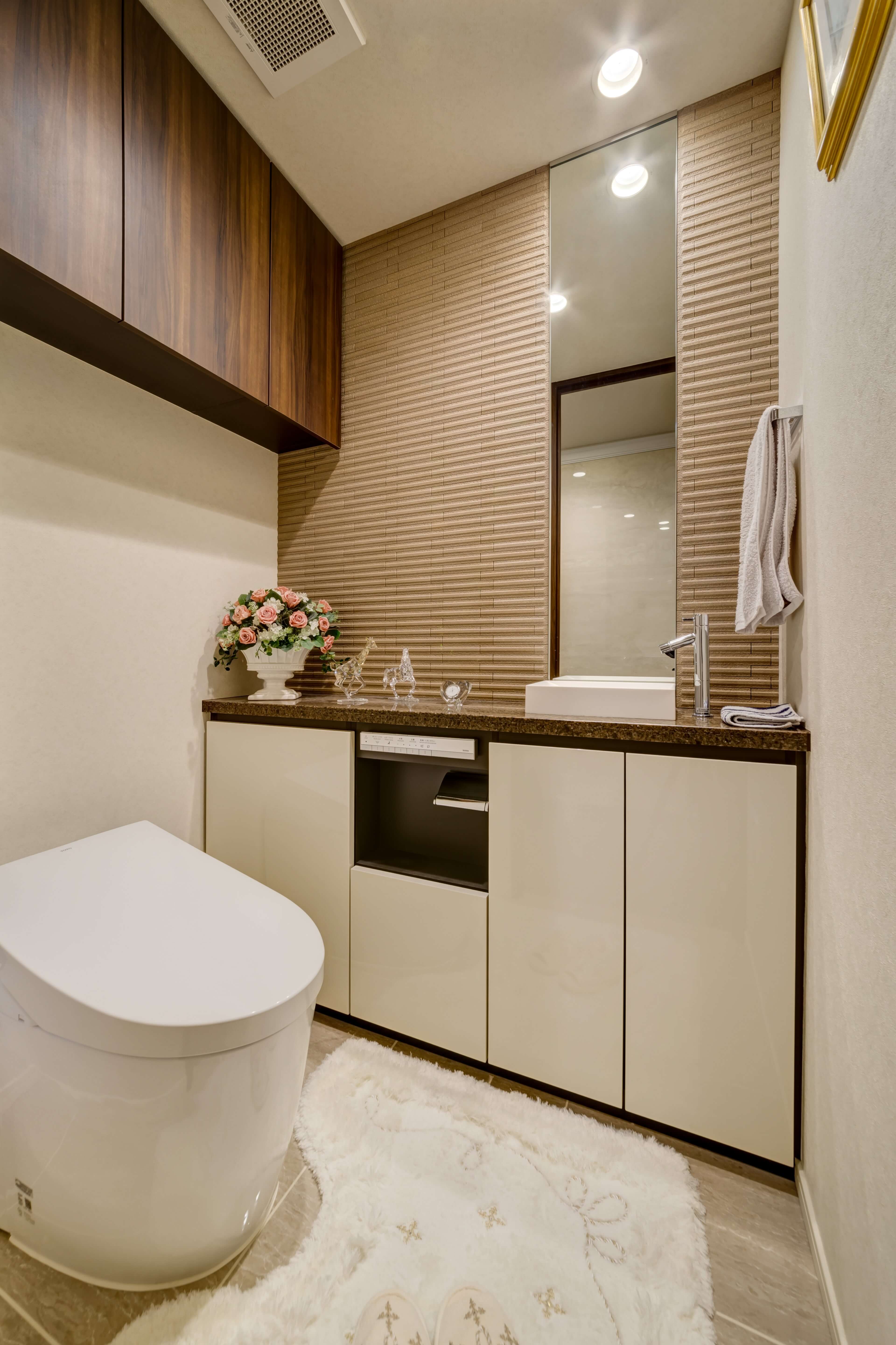 トイレ:ブラウン系エコカラットで既存ミラーや吊戸棚と調和。