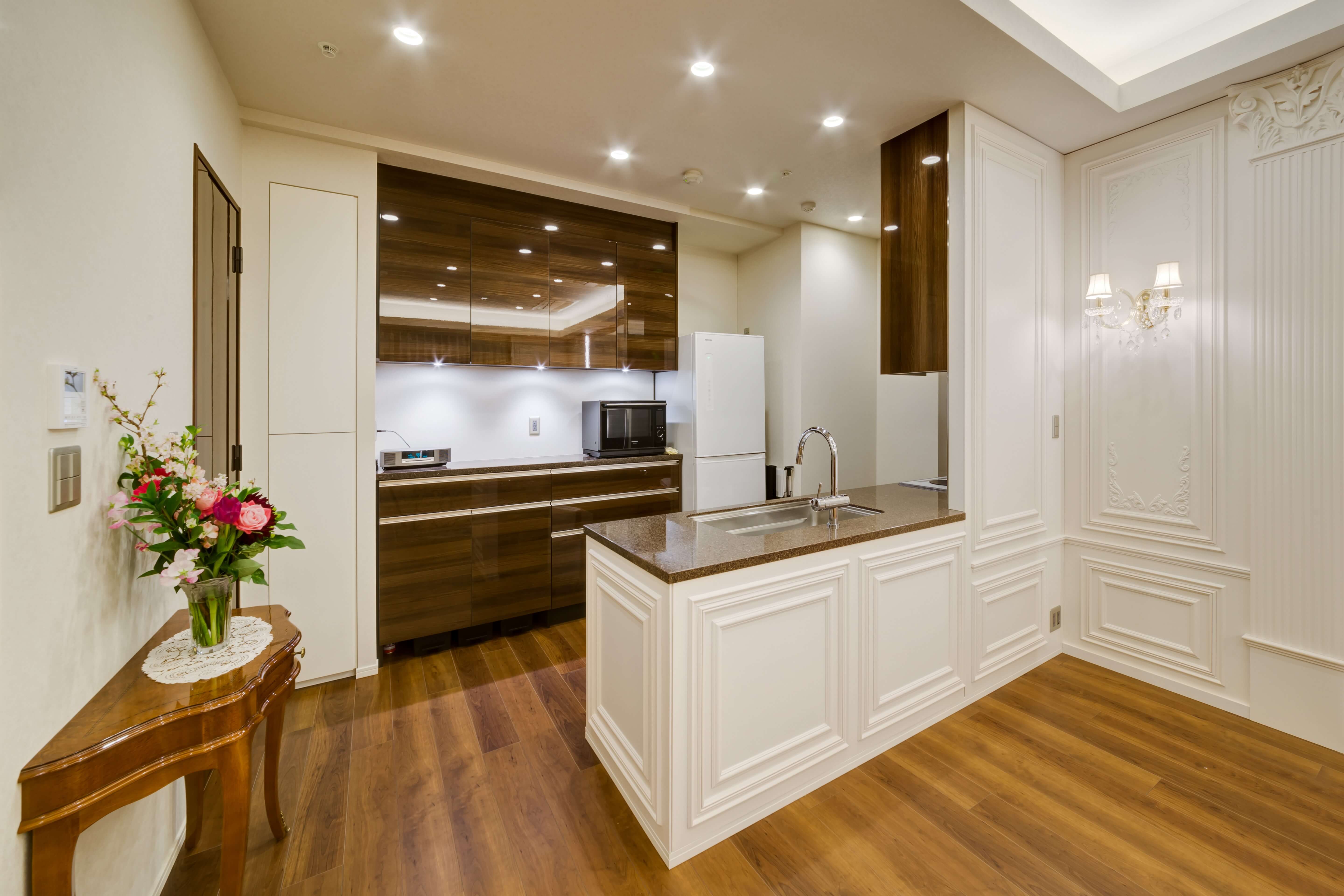 キッチン・ダイニング:モールディングパネルで空間に統一感を演出。