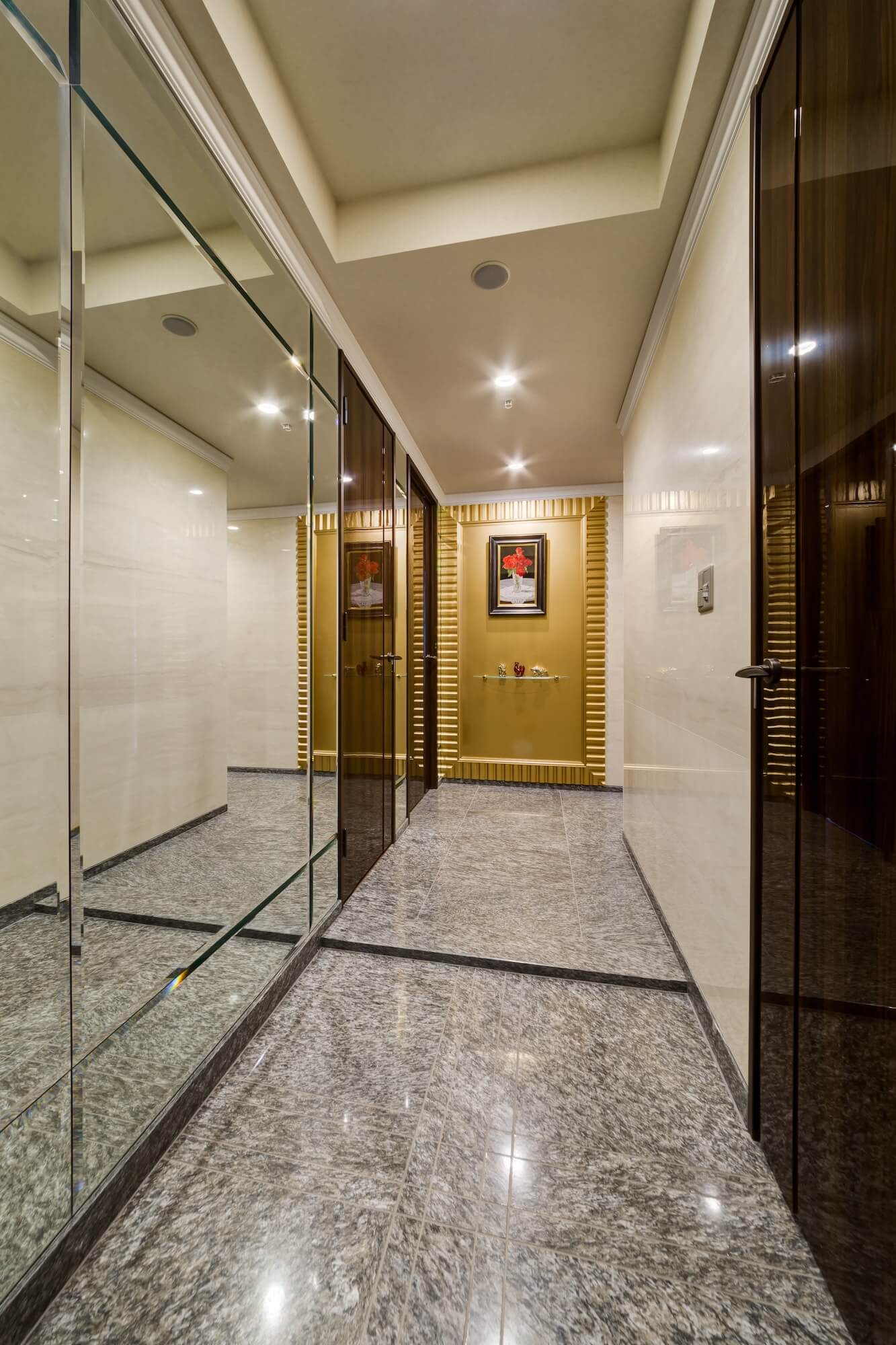 来客を迎える正面にゴールドのデザインパネルを配置。