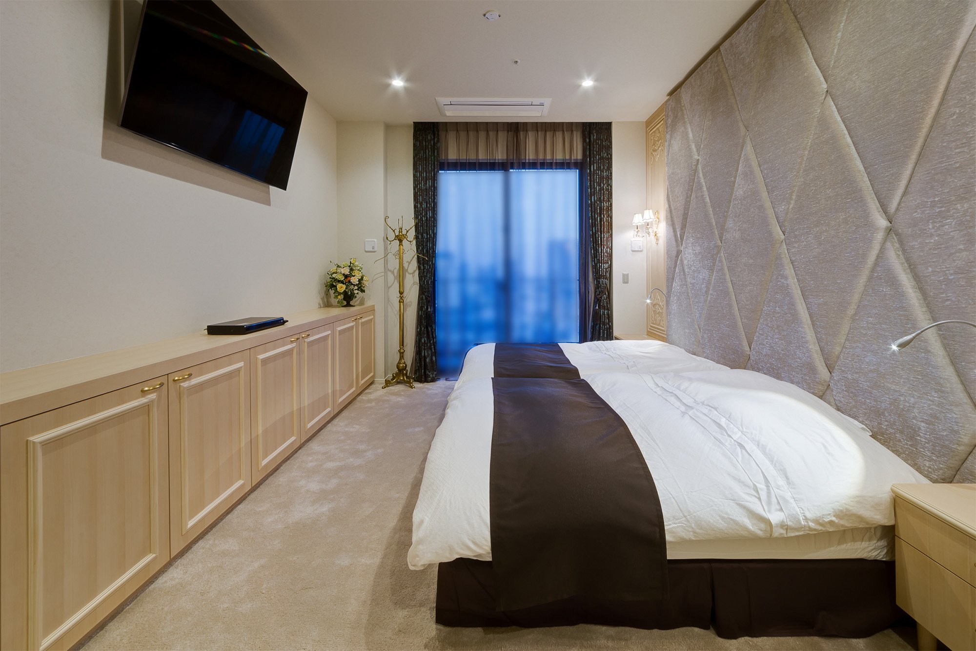 布張りのダイヤ型ヘッドボードとメープル突板でクラシカルな雰囲気に。